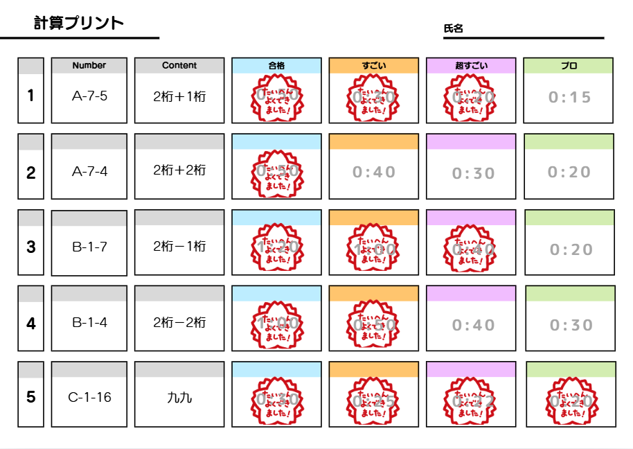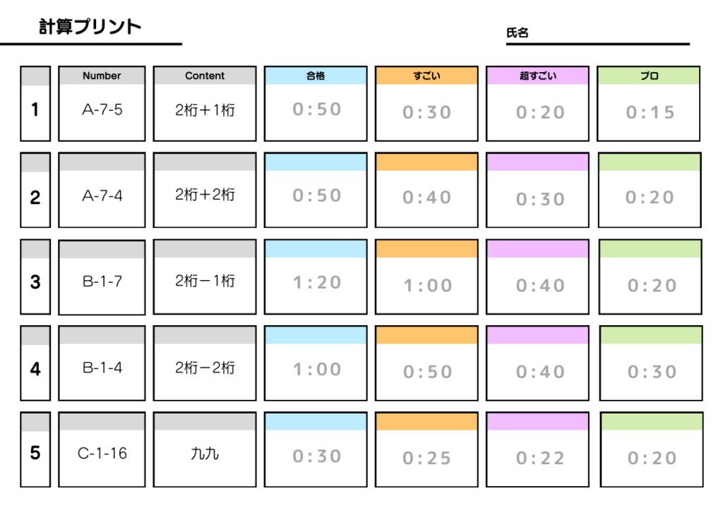 それぞれの項目に対応する計算プリントがあって、その目標タイムが書かれています。